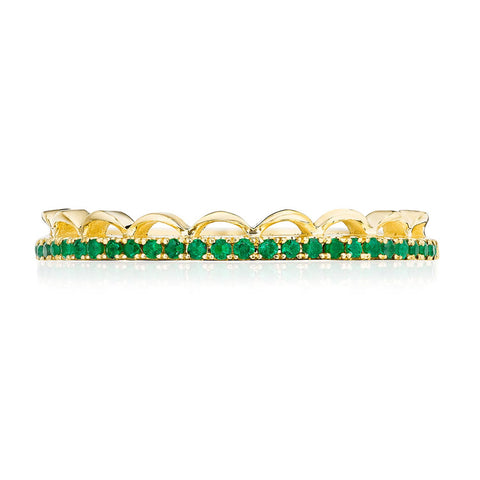 Every queen deserves her crown. Platinum and vibrant emeralds adorn this diadem ring, which works as both a fashion statement and wedding band.