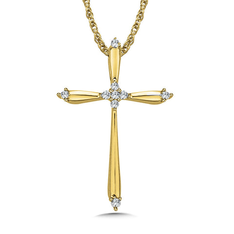 This scepter inspired 14K yellow gold cross with prong set diamonds on the cross's tips and in the center, features polished tapered arms, creating an elegant yet sparkling interpretation of the cross. With a secure rope chain, this pendant is perfect for any occasion.