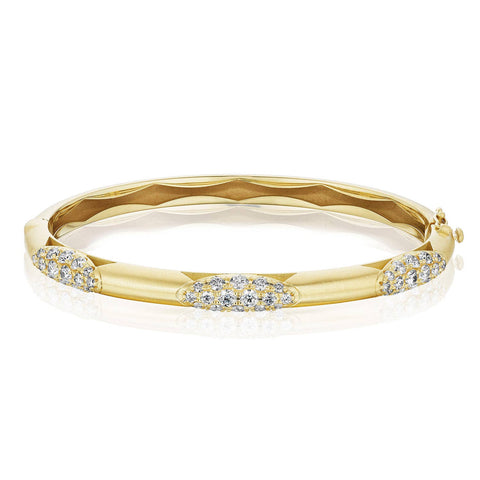 Three diamond-studded crescent-shaped ellipses add meticulous and eye-catching detail to this delicate - yet bold - bangle of 18kt gold.