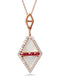 This diamond-shaped pendant dangles below a 14K rose gold kite-shaped bail & bar. The white mother of pearl pendant is framed by a diamond halo and features a bar of princess-cut rubies across the center.
