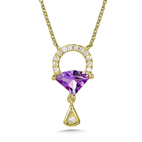 A fantasy-cut amethyst rests at the bottom of a diamond-adorned golden horseshoe. Below the gem, a petite golden pendant with a similar fantasy-shape and a single accent diamond dangles.