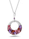 Oval and round amethyst, garnet, and pink tourmaline gems cluster together within the lower two-thirds of this abstract circular pendant. The upper portion of the pendant features multiple rows of pave-set diamonds. This unique pendant design dangles below a decorative polished bail with an amethyst accent stone. The gemstones are secured with dark, rhodium-plated prongs, creating a bold contrast to the vibrant white gold and diamonds.