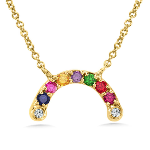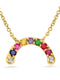 Resting on a yellow gold arch, blue, purple, pink, red, yellow, and green gems manifest a wonderful mini-rainbow design. With clear white gems at the base of the arch, it almost looks as if the rainbow is resting on clouds. This vibrant necklace will make everyday feel magical.