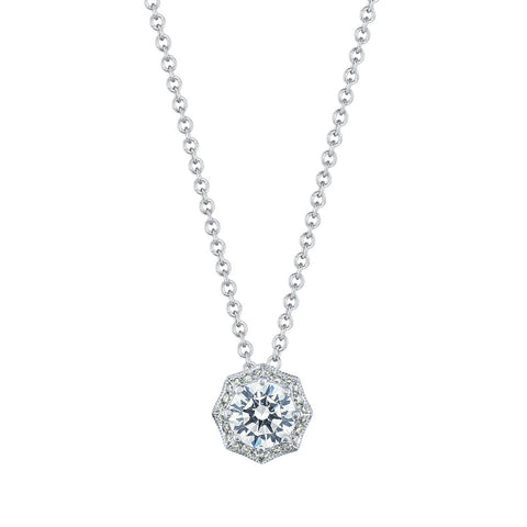 A flourish of diamonds creates prismatic perfection around the center diamond, and milgrain done exclusivley by hand provides the TACORI touch. Set on a round-link necklace, this piece is an evergreen classic. Center diamond sold separately.