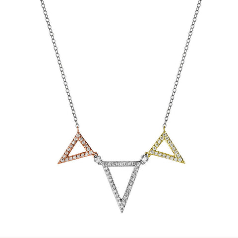 Three glistening open triangles, laced with accent diamonds, each set in a different gold, creates a bold geometrical statement that is perfect for an edgy look.