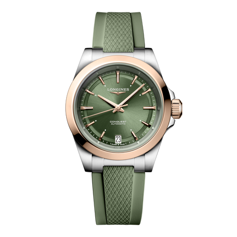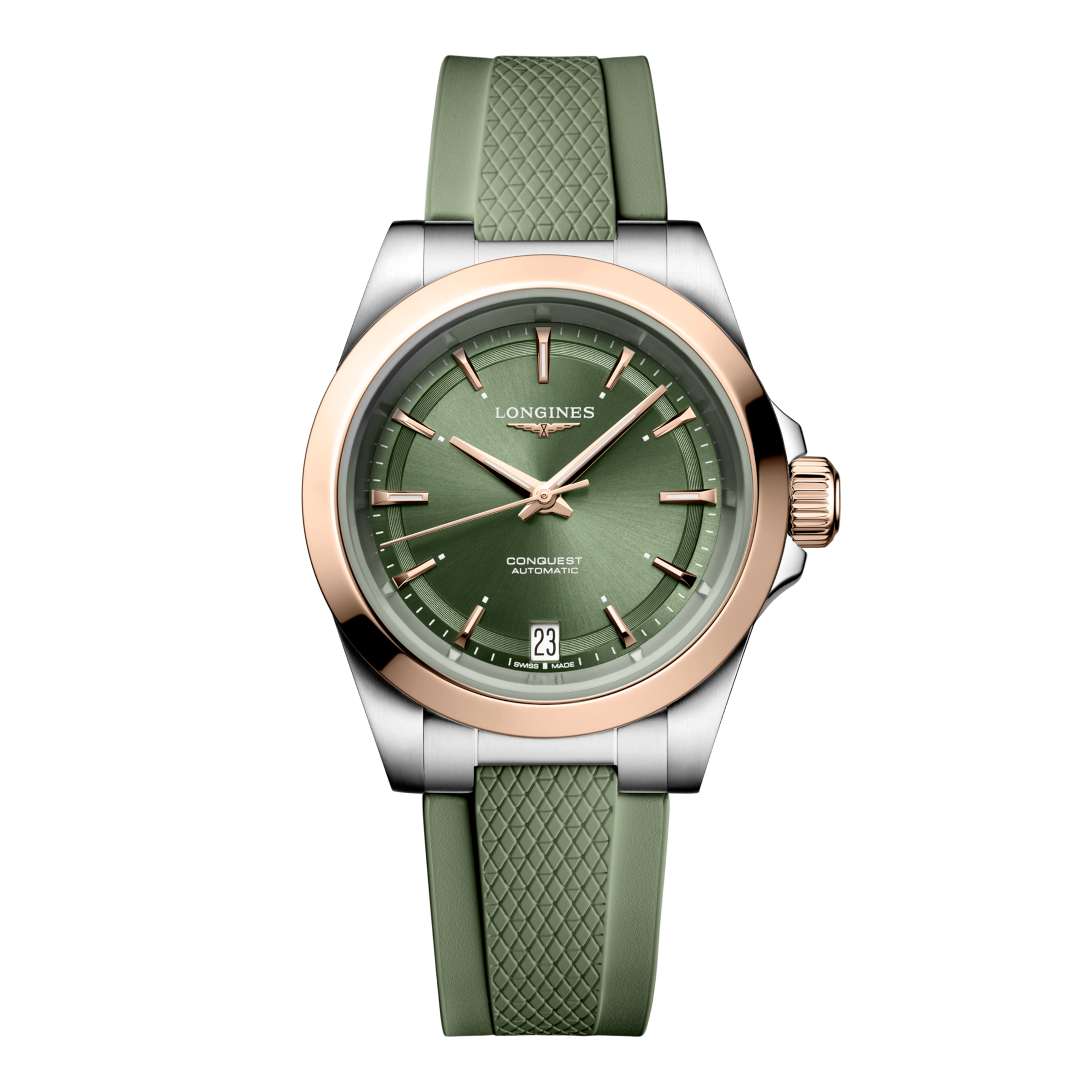 TECHNICAL DATAMODEL: L3.430.5.02.9 COLLECTION: Conquest SUB COLLECTION: Hydroconquest DIAL COLOR: Green STRAP COLOR: Green STRAP MATERIAL: Rubber STRAP BUCKLE: With double security folding clasp with micro adjustment system MOVEMENT: Automatic CALIBER: 888 CASE SHAPE: Round CASE SIZE: 34.00 mm CASE MATERIAL: Stainless steel and 18 karat pink gold cap 200 BEZEL MATERIAL: Screw-in crown WATER PROOF: 10 bar