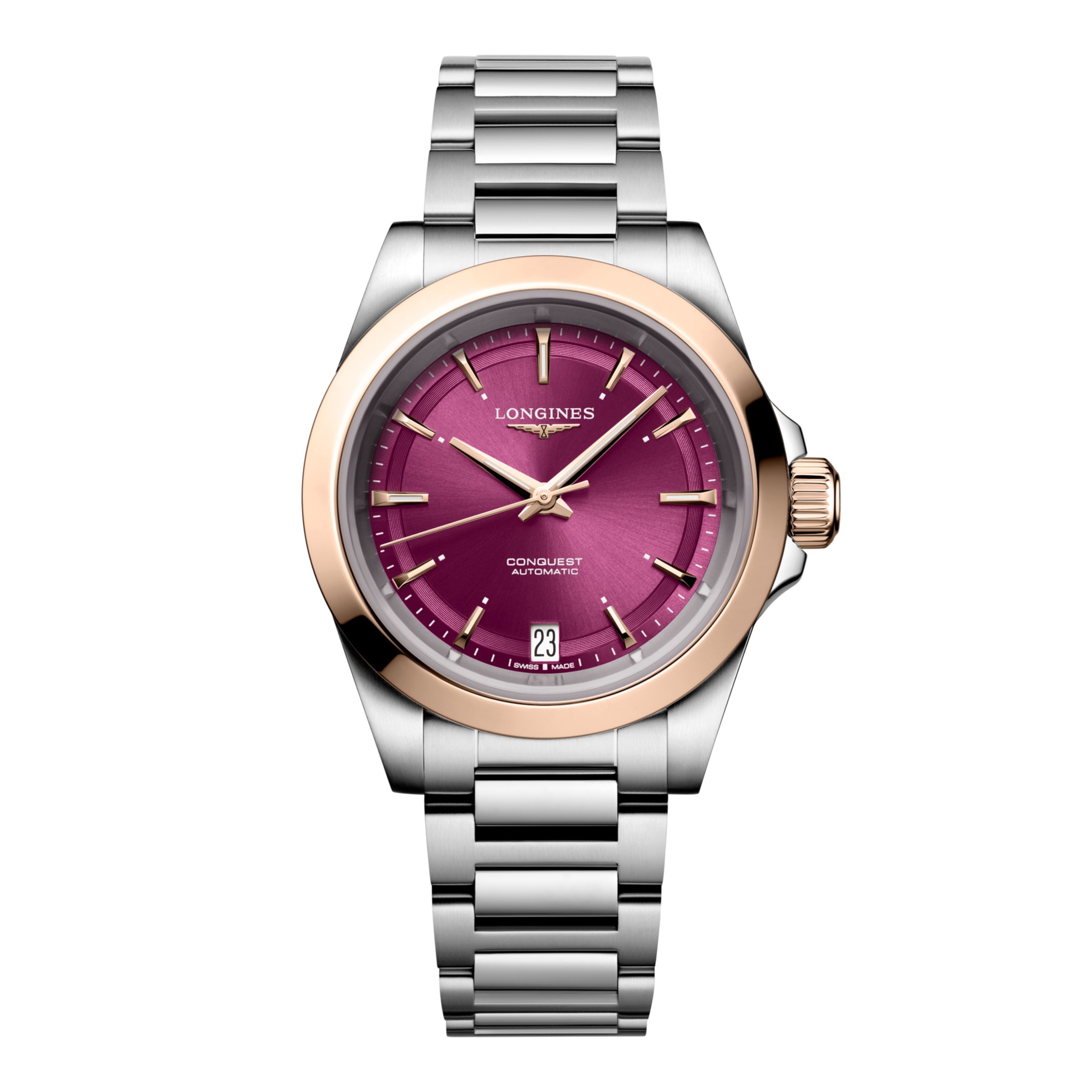TECHNICAL DATAMODEL: L3.430.5.98.6 COLLECTION: Conquest SUB COLLECTION: Hydroconquest DIAL COLOR: Purple STRAP MATERIAL: Stainless Steel STRAP BUCKLE: With triple safety folding clasp and push-piece opening mechanism MOVEMENT: Automatic CALIBER: 888 CASE SHAPE: Round CASE SIZE: 34.00 mm CASE MATERIAL: Stainless steel and 18 karat pink gold cap 200 BEZEL MATERIAL: Screw-in crown WATER PROOF: 10 bar