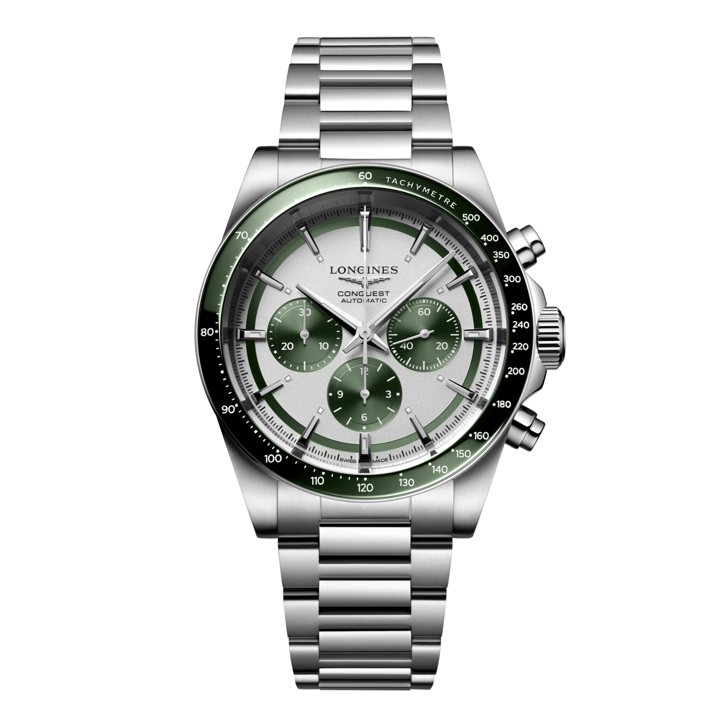 Chronograph Date, Self-winding mechanical movement beating at 28'800 vibrations per hour, with a power reserve up to 59 hours. Screw-in crown, Water-resistant to 10 bar, Scratch-resistant sapphire crystal, with several layers of anti-reflective coating on both sides. Silver matt with green counters dial, Swiss Super-LumiNova®. Stainless steel bracelet, With triple safety folding clasp and push-piece opening mechanism.