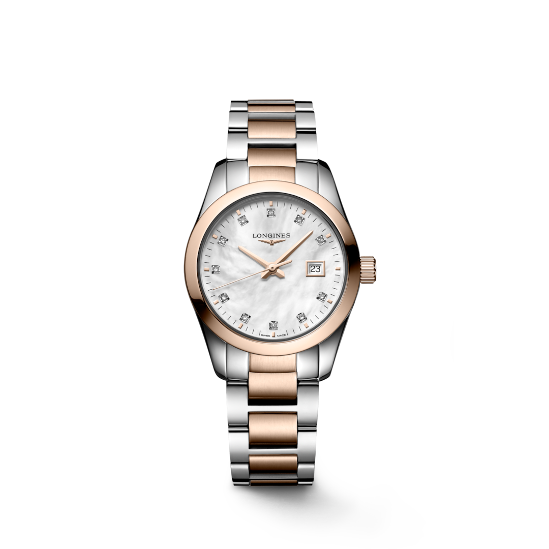 TECHNICAL DATAMOVEMENT: Quartz CALIBER: L152 WATERPROOF: Water-resistant to 5 bar CASE SIZE: 29.50 mm CASE SHAPE: Round CASE MATERIAL: Stainless steel and red PVD coating STRAP MATERIAL: Stainless steel and red PVD coating STRAP CLASP: With triple safety folding clasp and push-piece opening mechanism DIAL COLOR: White mother-of-pearl GLASS MATERIAL: Sapphire crystal CRYSTAL TYPE: Sapphire crystal