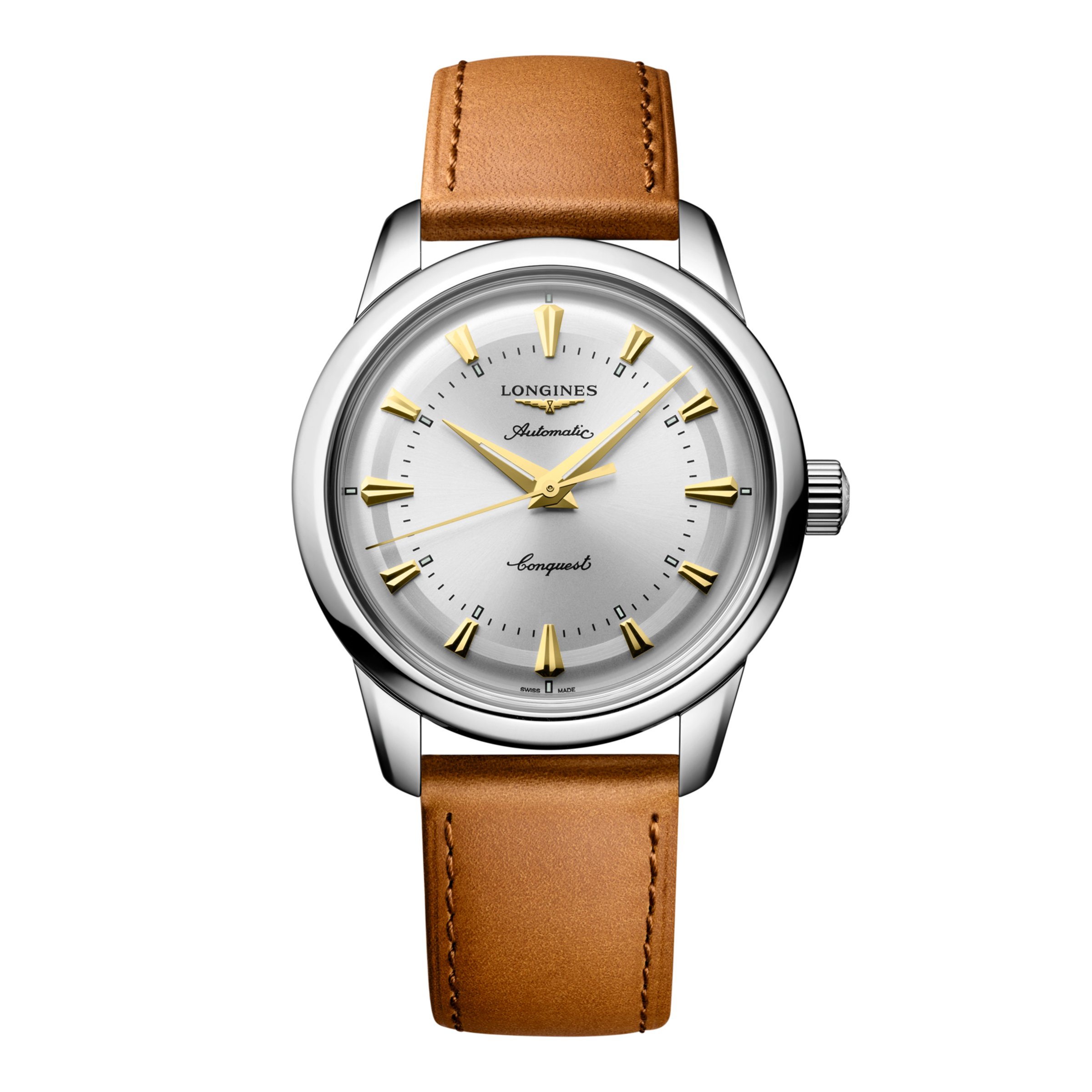 TECHNICAL DATAMODEL: L1.649.4.72.2 COLLECTION: Heritage SUB COLLECTION: Conquest Heritage DIAL COLOR: Silver STRAP COLOR: Brown STRAP MATERIAL: Leather STRAP BUCKLE: With Buckle Chronograph: Yes Chronograph Functions: Chronograph mechanism: central 60 seconds hand, 12 hours counter at 6 o'clock and 30 minutes counter at 9 o'clock MOVEMENT: Automatic CALIBER: 888 CASE SHAPE: Round CASE SIZE: 38.00 mm CASE MATERIAL: Stainless steel BEZEL MATERIAL: 18 karat gold medallion with fish WATER PROOF: 5 bar