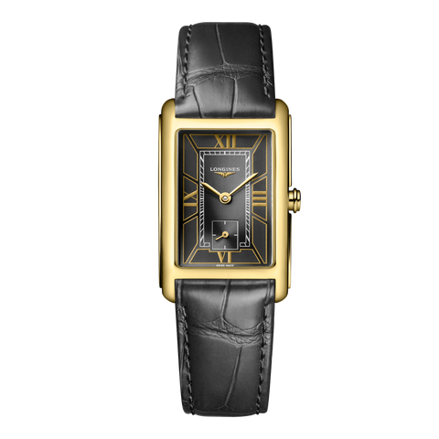 TECHNICAL DATAMODEL: L5.512.6.75.2 COLLECTION: Elegance SUB COLLECTION: Elegance DIAL COLOR: Anthracite STRAP COLOR: Anthracite STRAP MATERIAL: Alligator STRAP BUCKLE: With Buckle MOVEMENT: Quartz CALIBER: 176 CASE SHAPE: Rectangular CASE SIZE: 23.00 X 37.00 mm CASE MATERIAL: 18 karat yellow gold WATER PROOF: 3 bar