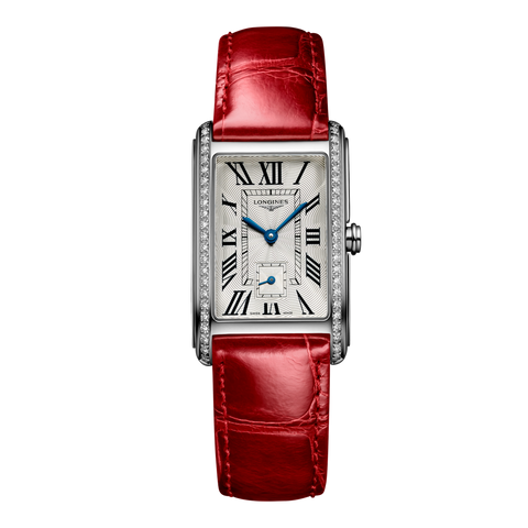 TECHNICAL DATAMODEL: L5.512.0.71.5 COLLECTION: Elegance SUB COLLECTION: Dolcevita DIAL COLOR: Silver STRAP COLOR: Red STRAP MATERIAL: Alligator STRAP BUCKLE: With Buckle MOVEMENT: Quartz CALIBER: 176 CASE SHAPE: Rectangular CASE SIZE: 23.30 X 37.00 mm CASE MATERIAL: Stainless steel WATER PROOF: 3 bar