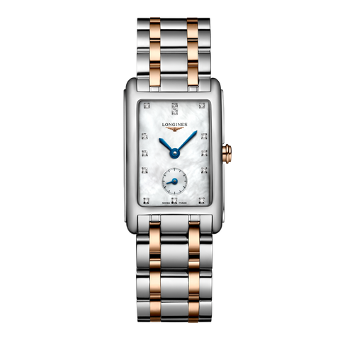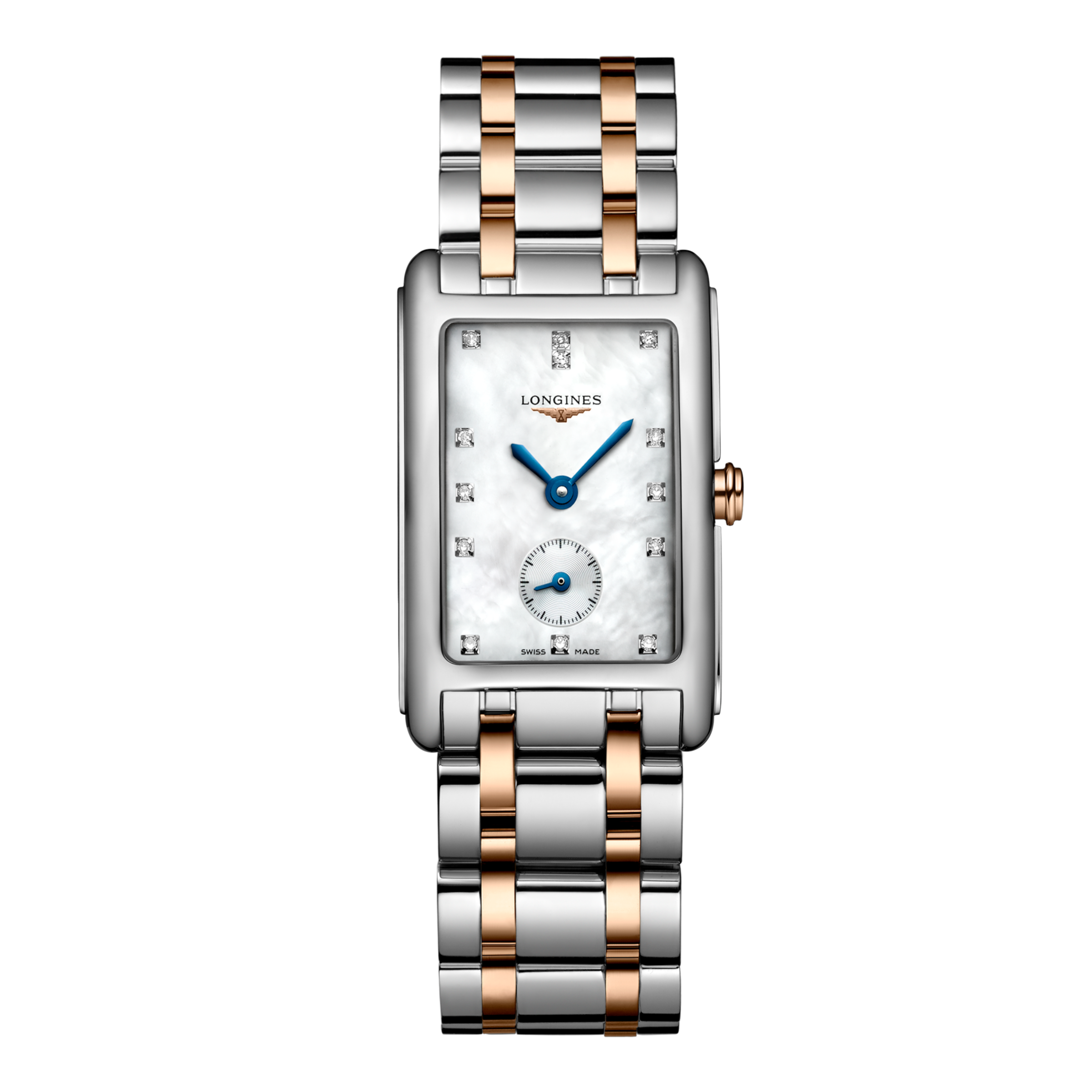 TECHNICAL DATAMODEL: L5.512.5.87.7 COLLECTION: Elegance SUB COLLECTION: Dolcevita DIAL COLOR: White STRAP MATERIAL: Stainless Steel STRAP BUCKLE: With triple safety folding clasp and push-piece opening mechanism MOVEMENT: Quartz CALIBER: 176 CASE SHAPE: Rectangular CASE SIZE: 23.30 X 37.00 mm CASE MATERIAL: Stainless steel with 18 karat pink gold crown WATER PROOF: 3 bar