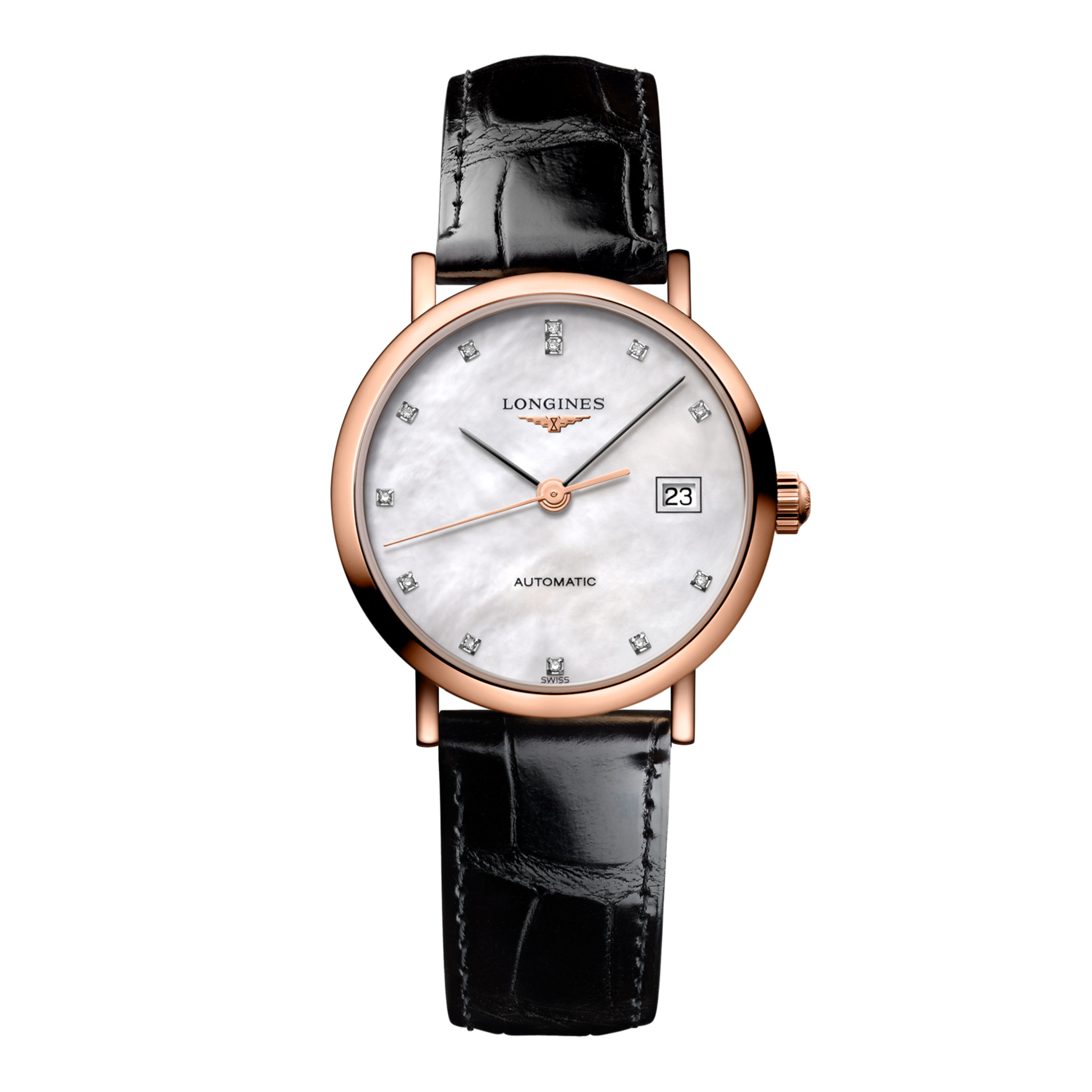TECHNICAL DATAMODEL: L4.378.8.87.4 COLLECTION: Elegance SUB COLLECTION: Elegant DIAL COLOR: White STRAP COLOR: Black STRAP MATERIAL: Alligator STRAP BUCKLE: With triple safety folding clasp and push-piece opening mechanism MOVEMENT: Automatic CALIBER: 592 CASE SHAPE: Round CASE SIZE: 27.20 mm CASE MATERIAL: 18 karat pink gold WATER PROOF: 3 bar