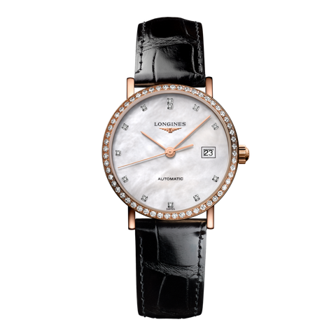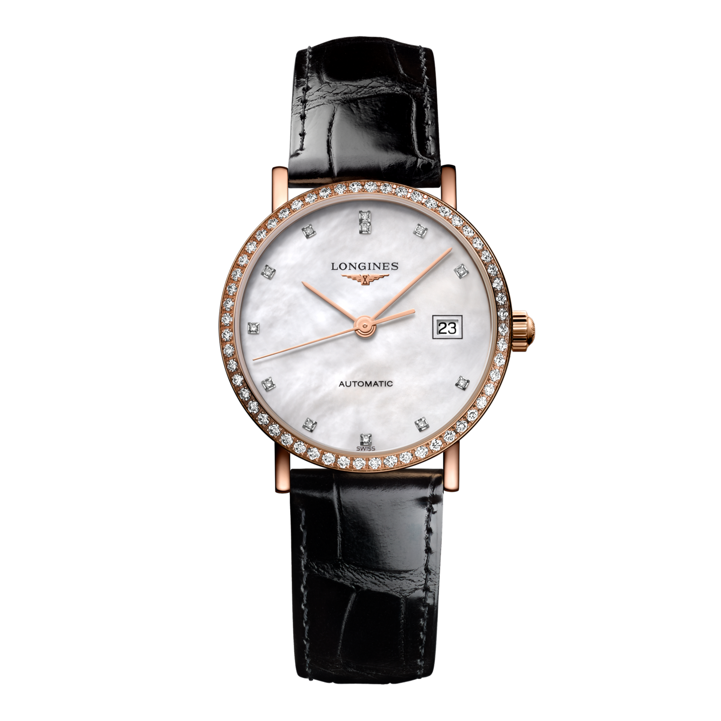 TECHNICAL DATAMODEL: L4.378.9.87.4 COLLECTION: Elegance SUB COLLECTION: Elegant DIAL COLOR: White STRAP COLOR: Black STRAP MATERIAL: Alligator STRAP BUCKLE: With triple safety folding clasp and push-piece opening mechanism MOVEMENT: Automatic CALIBER: 592 CASE SHAPE: Round CASE SIZE: 27.20 mm CASE MATERIAL: 18 karat pink gold WATER PROOF: 3 bar