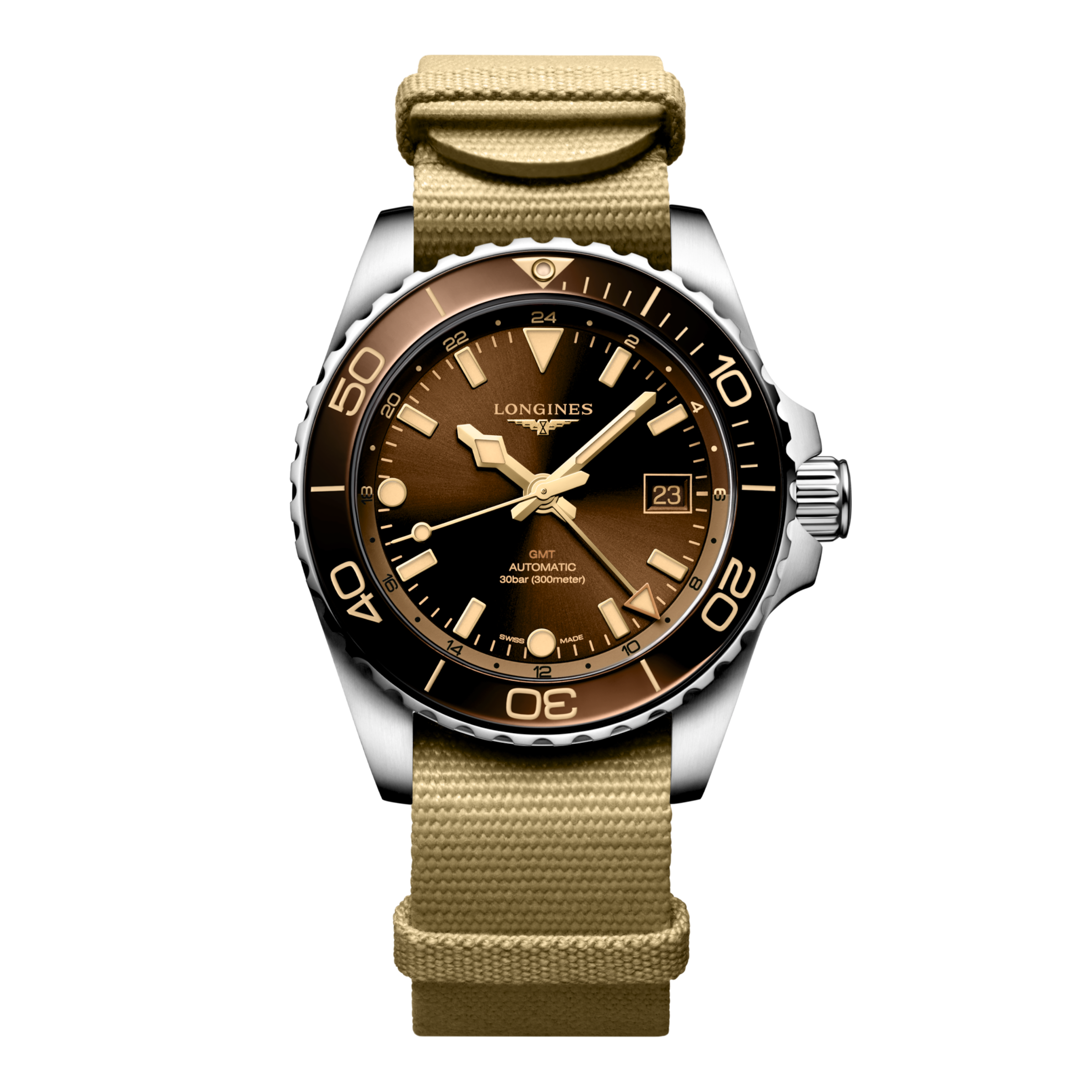 TECHNICAL DATAMODEL: L3.790.4.66.2 COLLECTION: Conquest SUB COLLECTION: Conquest DIAL COLOR: Brown STRAP COLOR: Beige STRAP MATERIAL: Nylon STRAP BUCKLE: With Buckle MOVEMENT: Automatic CALIBER: 844 CASE SHAPE: Round CASE SIZE: 41.00 mm CASE MATERIAL: Stainless steel and ceramic bezel BEZEL MATERIAL: Screw-in crown, Unidirectional rotating bezel WATER PROOF: 30 bar