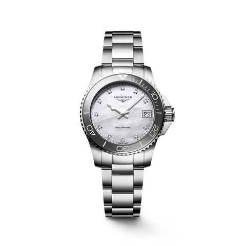 TECHNICAL DATAMOVEMENT: Quartz CALIBER: L156 WATERPROOF: Water-resistant to 30 bar CASE SIZE: 32.00 mm CASE SHAPE: Round CASE MATERIAL: Stainless steel and ceramic bezel STRAP MATERIAL: Stainless steel STRAP CLASP: With double safety folding clasp DIAL COLOR: White mother-of-pearl GLASS MATERIAL: Sapphire crystal CRYSTAL TYPE: Sapphire