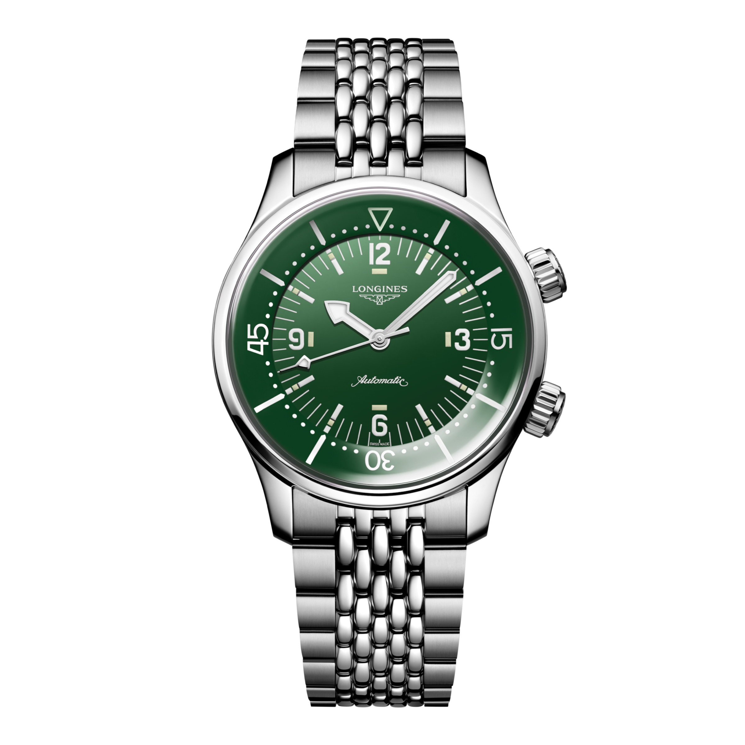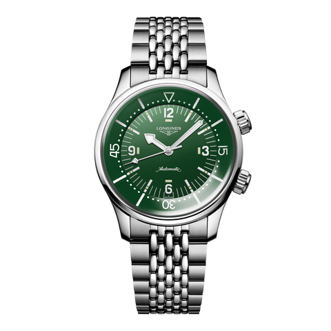 TECHNICAL DATAMODEL: L3.764.4.06.6 COLLECTION: Heritage SUB COLLECTION: Legend Diver DIAL COLOR: Green STRAP MATERIAL: Stainless Steel STRAP BUCKLE: With double security folding clasp with micro adjustment system MOVEMENT: Automatic CALIBER: 888 CASE SHAPE: Round CASE SIZE: 39.00 mm CASE MATERIAL: Stainless steel BEZEL MATERIAL: Internal turning diving flange, Screw-in crown WATER PROOF: 30 bar
