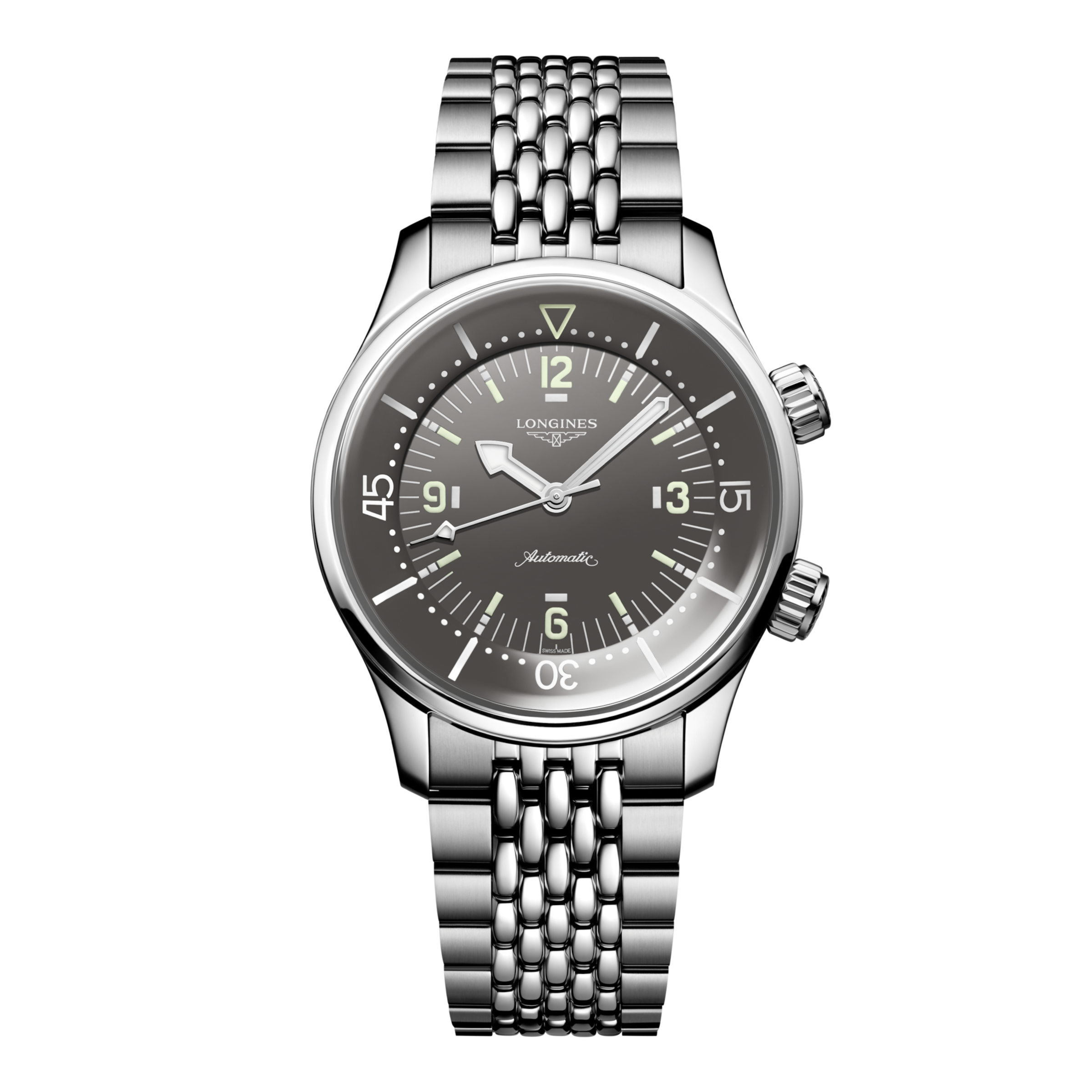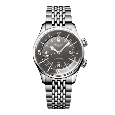 TECHNICAL DATAMODEL: L3.764.4.99.6 COLLECTION: Heritage SUB COLLECTION: Legend Diver DIAL COLOR: Gray STRAP MATERIAL: Stainless Steel STRAP BUCKLE: With double security folding clasp with micro adjustment system MOVEMENT: Automatic CALIBER: 888 CASE SHAPE: Round CASE SIZE: 39.00 mm CASE MATERIAL: Stainless steel BEZEL MATERIAL: Internal turning diving flange, Screw-in crown WATER PROOF: 30 bar