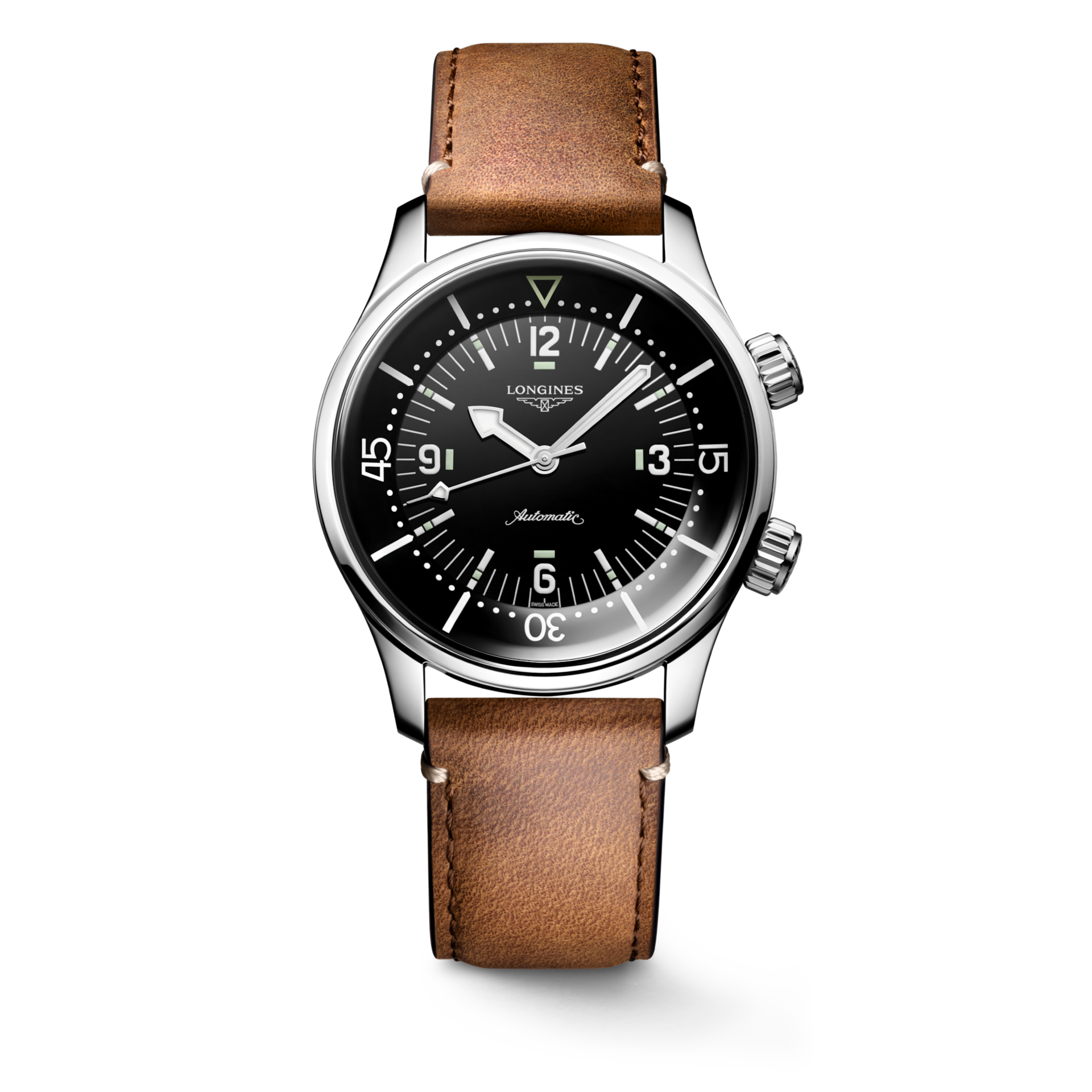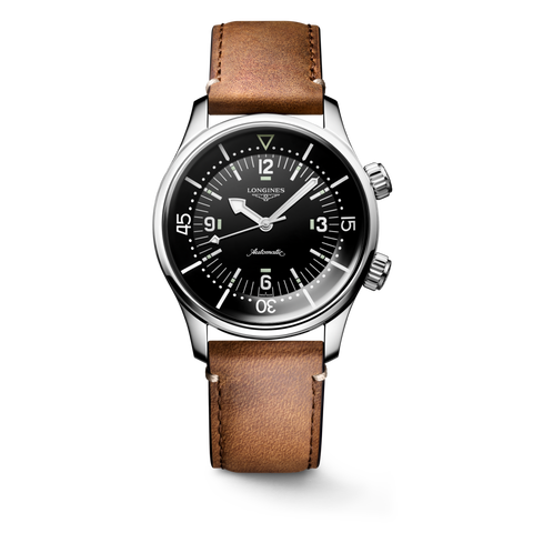 Longines Legend Diver It is immediately recognisable by its two crowns and internal rotating bezel. The new LONGINES LEGEND DIVER is resurfacing with a 39 mm diameter, faithful to the original 1959 model from which it takes its inspiration. Certified as a Divers' Watch with a water-resistance up to 30 bar / 300 metres, the model is driven by an exclusive Longines L888.6 calibre resistant to magnetic fields and equipped with a silicon balance-spring. This movement has a power reserve of up to 72 hours. The entire watch is chronometer-certified by COSC. The hours are marked by elongated indexes and raised luminescent Arabic numerals. The rhodium-plated and polished arrow-hands, coated with Super LumiNova®, mark the time with optimum visibility in all circumstances. The collection's symbol, a diver, is stamped on the watch's perfectly-angled screw-down case back. This black dial model is presented on a brown leather strap with a steel tongue buckle.