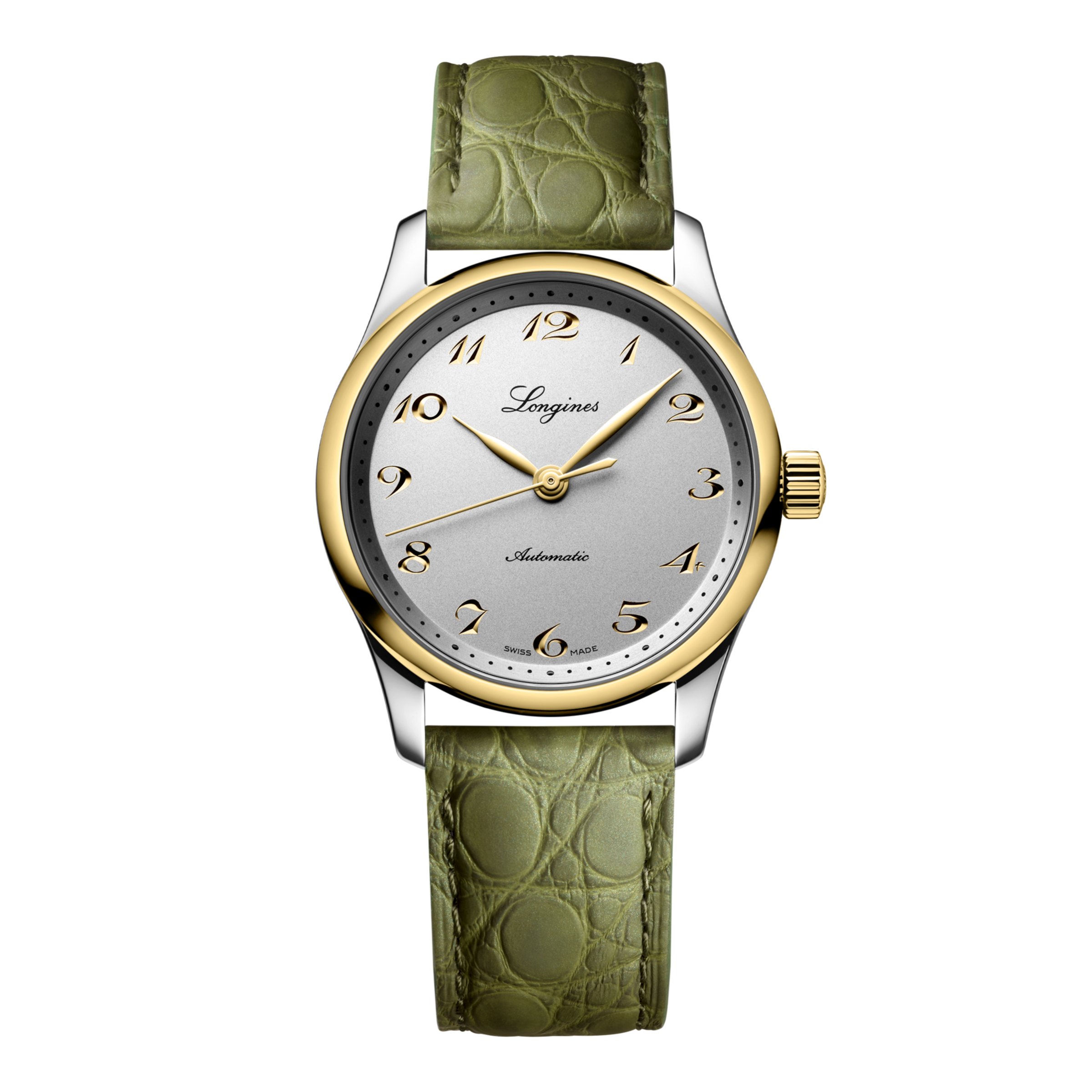 TECHNICAL DATAMODEL: L2.357.5.72.2 COLLECTION: Master DIAL COLOR: Silver STRAP COLOR: Green STRAP MATERIAL: Alligator STRAP BUCKLE: With triple safety folding clasp and push-piece opening mechanism MOVEMENT: Automatic CALIBER: 888 CASE SHAPE: Round CASE SIZE: 34.00 mm CASE MATERIAL: Stainless steel and 18 karat yellow gold cap 200 WATER PROOF: 3 bar