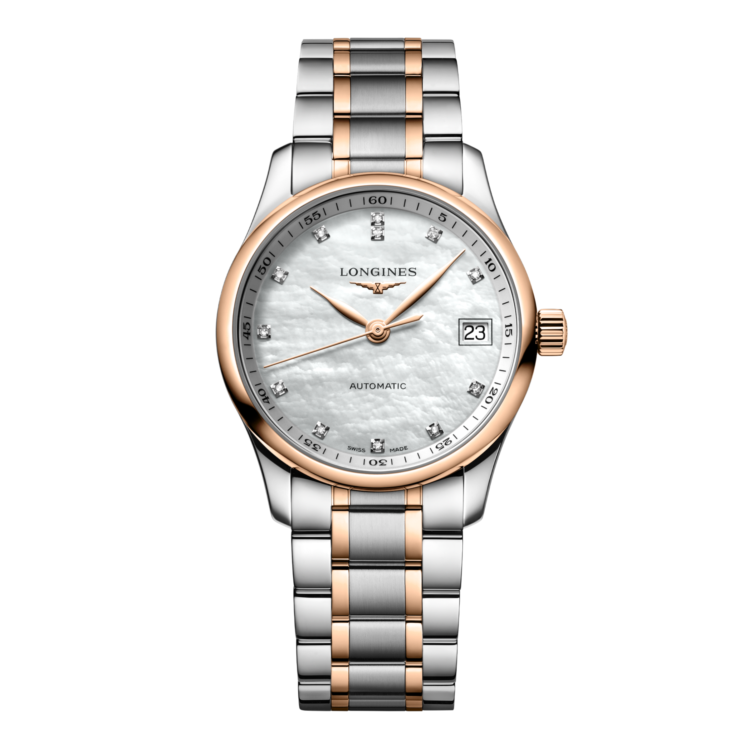 TECHNICAL DATAMODEL: L2.357.5.89.7 COLLECTION: Master SUB COLLECTION: Master DIAL COLOR: White STRAP MATERIAL: Stainless Steel STRAP BUCKLE: With triple safety folding clasp and push-piece opening mechanism MOVEMENT: Automatic CALIBER: 888 CASE SHAPE: Round CASE SIZE: 34.00 mm CASE MATERIAL: Stainless steel and 18 karat pink gold cap 200 WATER PROOF: 3 bar