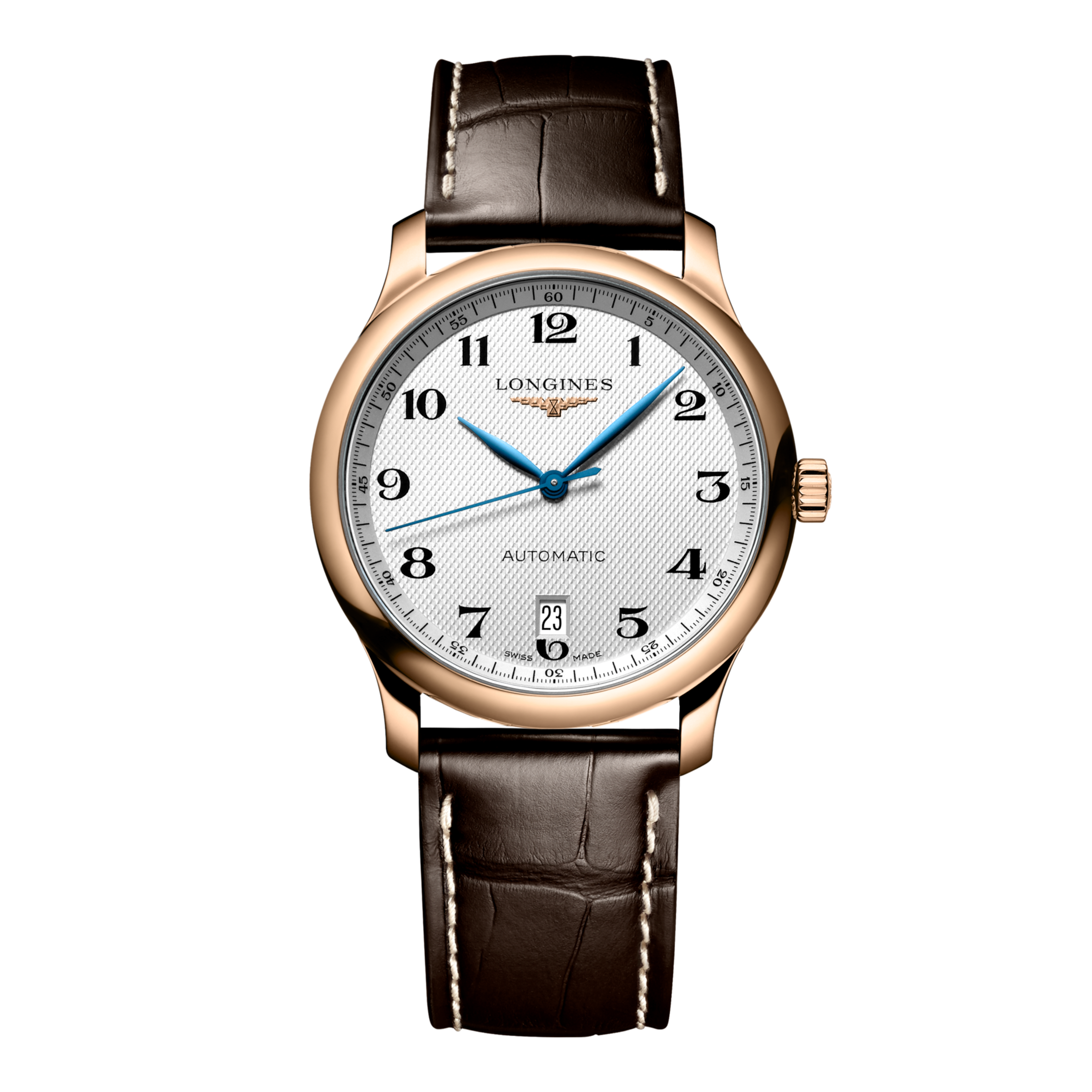 TECHNICAL DATAMODEL: L2.628.8.78.3 COLLECTION: Master DIAL COLOR: Silver STRAP COLOR: Brown STRAP MATERIAL: Alligator STRAP BUCKLE: With triple safety folding clasp and push-piece opening mechanism MOVEMENT: Automatic CALIBER: 888 CASE SHAPE: Round CASE SIZE: 38.50 mm CASE MATERIAL: 18 karat pink gold WATER PROOF: 3 bar