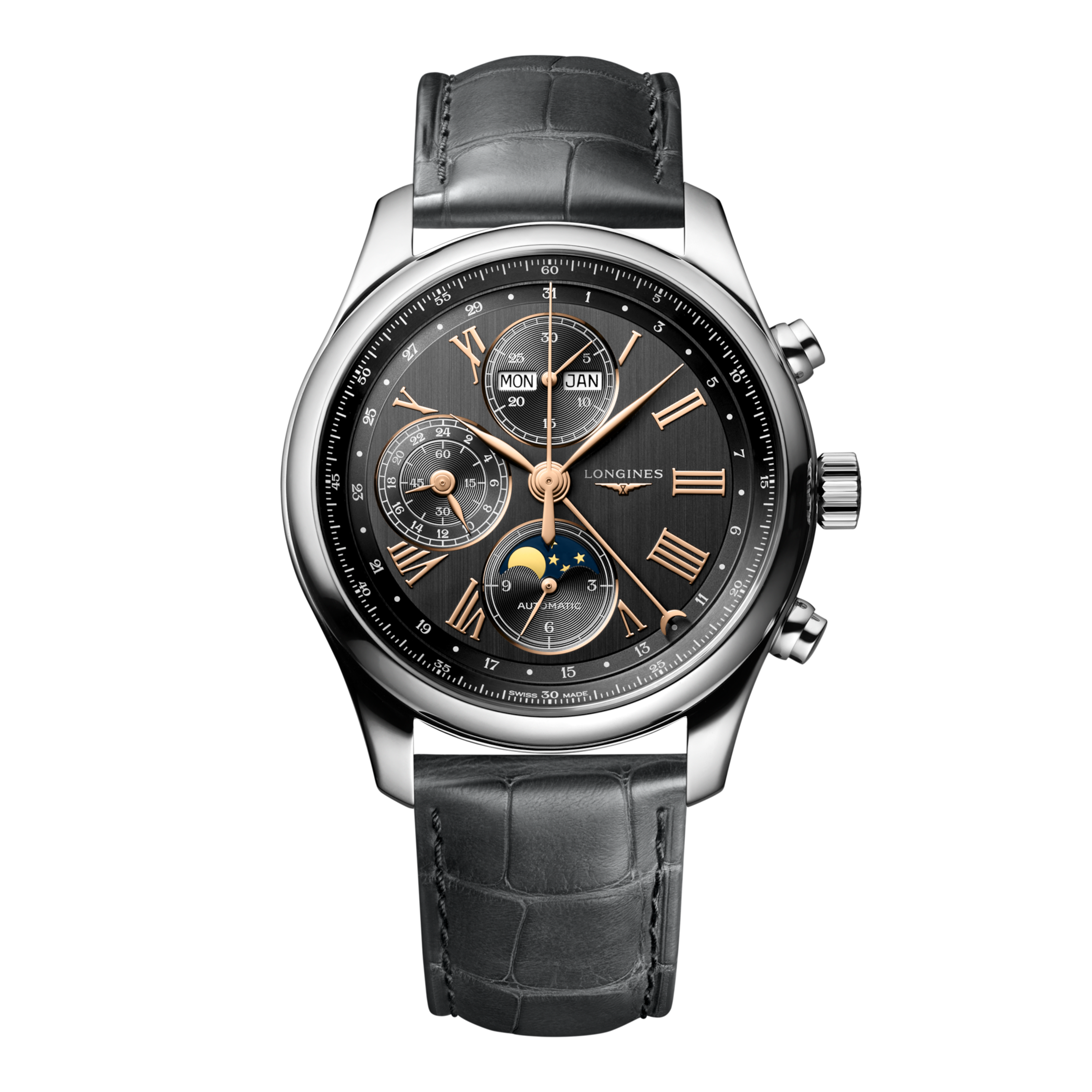 Chronograph Moonphase Date, Self-winding mechanical movement beating at 28'800 vibrations per hour, with a monocrystalline silicon balance-spring power reserve up to 66 hours. Water-resistant to 3 bar, Scratch-resistant sapphire crystal, with several layers of anti-reflective coating on both sides. Anthracite dial. Alligator strap bracelet, With triple safety folding clasp and push-piece opening mechanism.