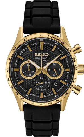 From the Essentials Collection. Designed to evoke the cool thrill of driving by night, this smooth chronograph offers a slim profile for sleek sport or everyday wear. Framed by a gold tachymeter bezel, the rich black dial with gold accents adds a streetwear edge with its y-shaped shoe-sole inspired pressed pattern. With three subdials, including a 24-hour indicator and a date calendar, the dial also features LumiBrite hands and markers. Chronograph timing provides measurement of up to 60 minutes of elapsed time in 1/5-second increments. Crafted of stainless steel, the case features a gold finish and a scratch resistant sapphire crystal, and is paired with a black silicone strap. 10 bar, 100M Water Resistant
