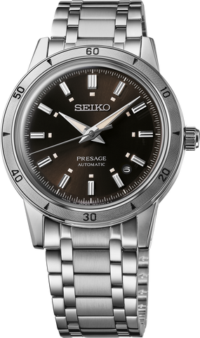 Presage Style60's Collection. Celebrating the fresh spirit of the 1960s, this design is an homage to Seiko's 1964 “Crown Chronograph,” combining a bold ruggedness with a refined and tailored style. Framed by a metallic bezel with laser engraved details, the sunray finish dial inherits the layout of the original model with a dark brown color inspired by vintage work jackets. The faceted indices are polished for an elegant shine, enhanced by the stainless steel case and box shaped crystal, providing beautiful dimensionality. Visible underneath the screwdown see-through caseback, the 23-jewel automatic movement beats at a frequency of 21,600 vibrations per hour and offers manual winding capability with a power reserve of approximately 41 hours. Crafted of stainless steel, this versatile timepiece features a sophisticated multi-row bracelet, tri-fold push button release clasp, a date calendar and LumiBrite hands and markers for superior visibility. 5 bar, 50M Water Resistant
