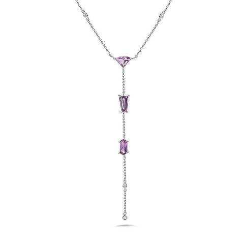 Cascading downwards along a single chain, an elongated hexagon amethyst dangles beneath a baguette amethyst, which hangs below a fantasy cut amethyst. Additionally, a few petite bezeled diamonds dangle below the gemstones. The neck chain also features petite bezeled diamonds for a little extra sparkle.