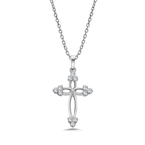 The body of this cross feature sleek open marquise shapes, tipped with three accent diamonds on every arm. This whimsical look captures the spirit of belief and youth, making it a beautiful center piece to any outfit.