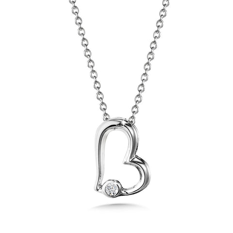 Following current trends, this heart is dramatically tilted, adding more visual interest to this already glistening open pendant. This glowing asymmetrical heart with a glistening bezeled accent diamond is the perfect gift for a loved one.