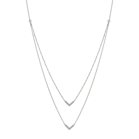 V-shaped diamond tips add a sharp element to this otherwise dainty chain. Following the top trends, the design creates the illusion of 2 layered necklaces by featuring a split duel chain design.