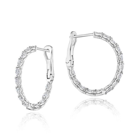 Delicate hoop earrings of 18k White Gold are meticulously hand-set with pear-cut diamonds. Milgrain-studded TACORI Crescent detailing decorates the silhouette.