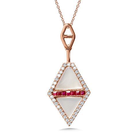 This diamond-shaped pendant dangles below a 14K rose gold kite-shaped bail & bar. The white mother of pearl pendant is framed by a diamond halo and features a bar of princess-cut rubies across the center.