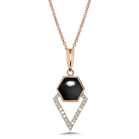 A perfectly symmetrical hexagon-cut onyx framed in polished rose gold dangles below a polished teardrop bail. For an extra touch of sparkle, a triangular-shaped diamond frame appears below the hexagon, elongating the pendant.