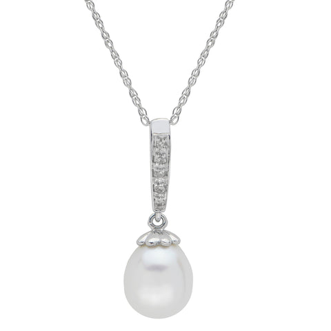 14kt White gold 8-8.5mm freshwater cultured pearl rice cultured pearl & diamond (.03 ctw) pendant on 18" rope chain.