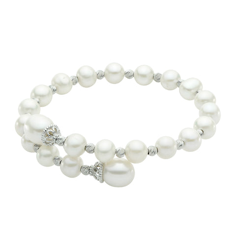 This 8 Inch bangle bracelet is made with freshwater cultured pearls and our signature sterling diamond cut beads creating the look of shimmering diamonds.