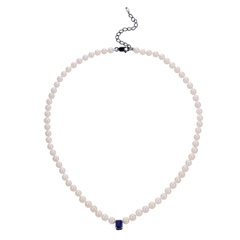 16"+2" 925 BLK/ RH 5-5.5MM FWCP & CREATED BLUE SAPPHIRE NECKLACE