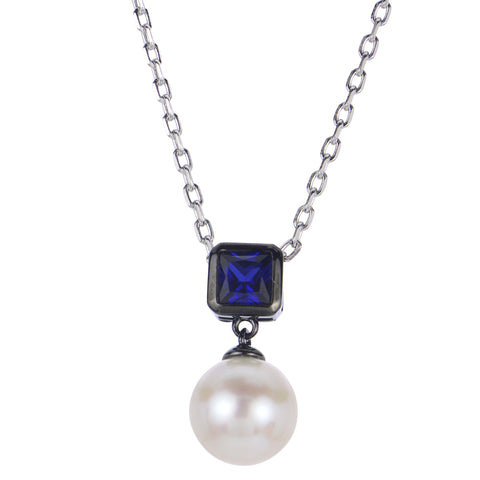 18" 925 BLK/RH 7.5-8MM AA FWCP & CREATED BLUE SAPPHIRE NECKLACE
