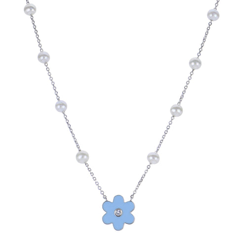13"+3" EXT 925 4-4.5MM FWCP WH.TOPAZ & LIGHT BLUE RESIN ENAMEL FLOWER NECKLACE