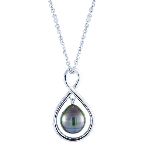 18" Sterling infinity pendant necklace featuring a beautiful 9-10MM Tahitian cultured pearl drop, with a 2" extender.