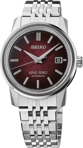 From the King Seiko Collection Re-interpretation of the sleek and innovative KSK of the 1960s Inspired by traditional Japanese Ukiyo-e art Gradated red dial with a plum tree blossom pattern Distinctive slim case design Automatic with manual winding capability Rapid date change mechanism Date calendar Diamond-cut hands Meticulously cut dimensional indices with separately carved 12 o’clock marker King Seiko crest on caseback and crown Deployment clasp with push button release