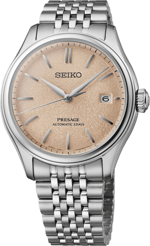 Presage Classic Series. Offering the finest in Japanese mechanical watchmaking, the Presage Collection blends precision technology with superior craftsmanship and design. The Presage Classic Series draws from the colors, materials and textures of traditional crafts, each timepiece gracefully expressing Japan’s timeless beauty. In “araigaki”, a washed and bleached persimmon color, the curved dial of this streamlined design has a richly textured pattern that evokes the lustrous fabric, while capturing and reflecting ambient light to create a heightened sense of depth and beauty. Visible through the screwdown, see-through caseback, Seiko’s 6R caliber, 24-jewel automatic movement beats at a frequency of 21,600 vibrations per hour, with an exceptional power reserve of 72 hours, manual winding capability and a date calendar complication. Crafted of stainless steel, the case is constructed with smooth curved surfaces and includes a dual curved sapphire crystal, echoing the contours of the dome-shaped dial. The retro-inspired multi-row bracelet with curved top surfaces helps achieve a superbly sleek and comfortable fit and is equipped with a deployment clasp with push button release. 10 bar, 100M Water Resistant