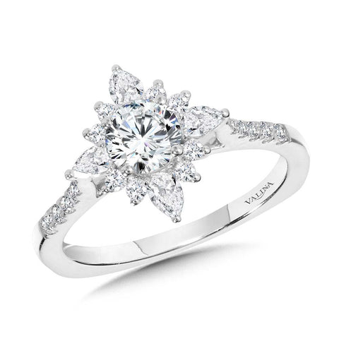 Name | PRONG-TIPPED & PEAR-ACCENTED SUN BURST DIAMOND HALO ENGAGEMENT RING R2206W |