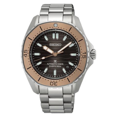 Prospex Automatic Diver's Watch Automatic with manual winding capability Rose gold tone uni-directional rotating elapsed timing bezel with a unique polygonal shape Warm gray pressed pattern dial Date calendar LumiBrite hands and markers Screwdown crown and caseback Tri-fold push button release clasp with secure lock and extender