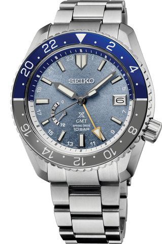 Prospex LX GMT U.S. Special Edition Inspired by the view of the sun setting behind earth, creating a halo effect and marking where the planet ends, and space begins. Spring Drive GMT Automatic with manual winding capability Dark blue and gray sapphire GMT bezel marked in 24 one-hour increments Gray-blue dial with a pattern reminiscent of the topography of earth Power reserve indicator Date calendar LumiBrite hands and markers Gold-tone GMT hand Screwdown crown and caseback Tri-fold push-button release clasp