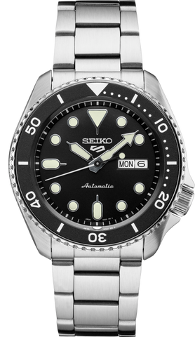 Seiko 5 Sports Manual and automatic winding capabilities Black dial and unidirectional rotating bezel Day/date calendar LumiBrite hands and markers