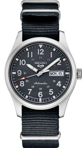 Seiko 5 Sports Collection Inspired by vintage field/military style Automatic with manual winding capability Blue-gray dial Day/date calendar Luminous hands and markers Red-orange tipped second hand Screwdown see-through caseback